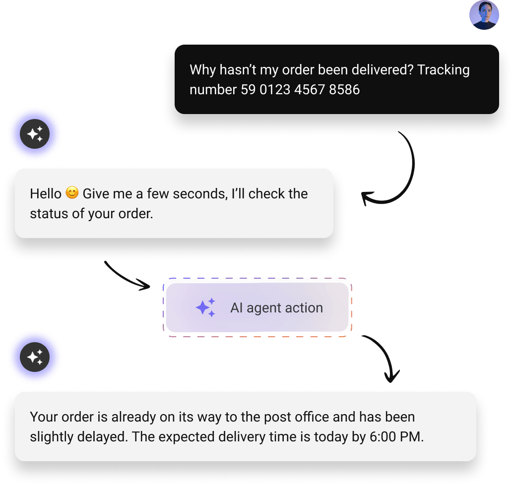 The Intelswift chatbot is powered by AI agents. This means that inside the chat window, it’s not just a linear bot, but an AI agent that responds almost like a human, carries on a conversation, and makes decisions. It can also perform actions — for example, check your system for product availability or update a customer’s delivery address.