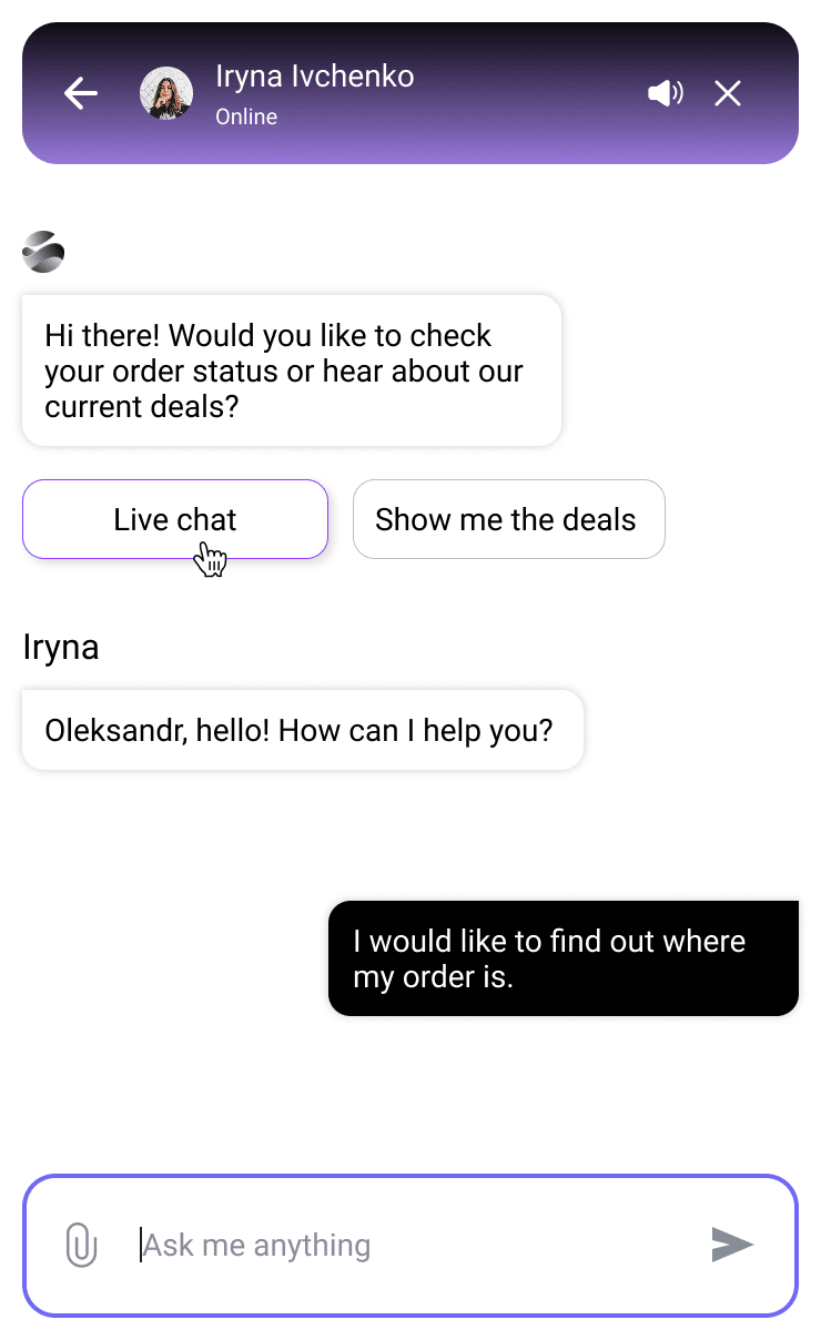 By default, AI replies to your customers first. But this can easily be changed in settings. Your operators can see all conversations and receive notifications about new messages. They have full conversation context, making the chat productive from the very first second.