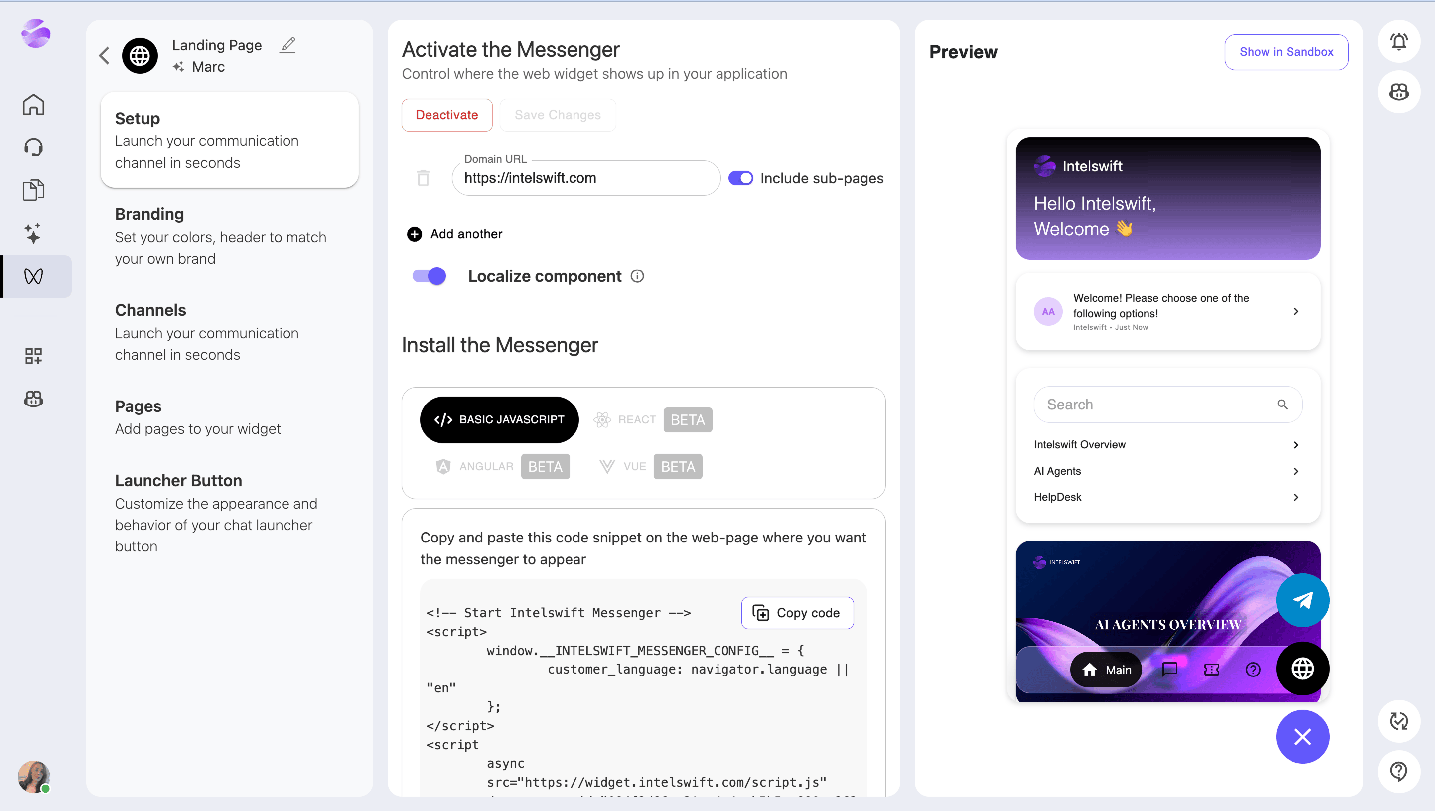 Generate the code and launch the chat on your website