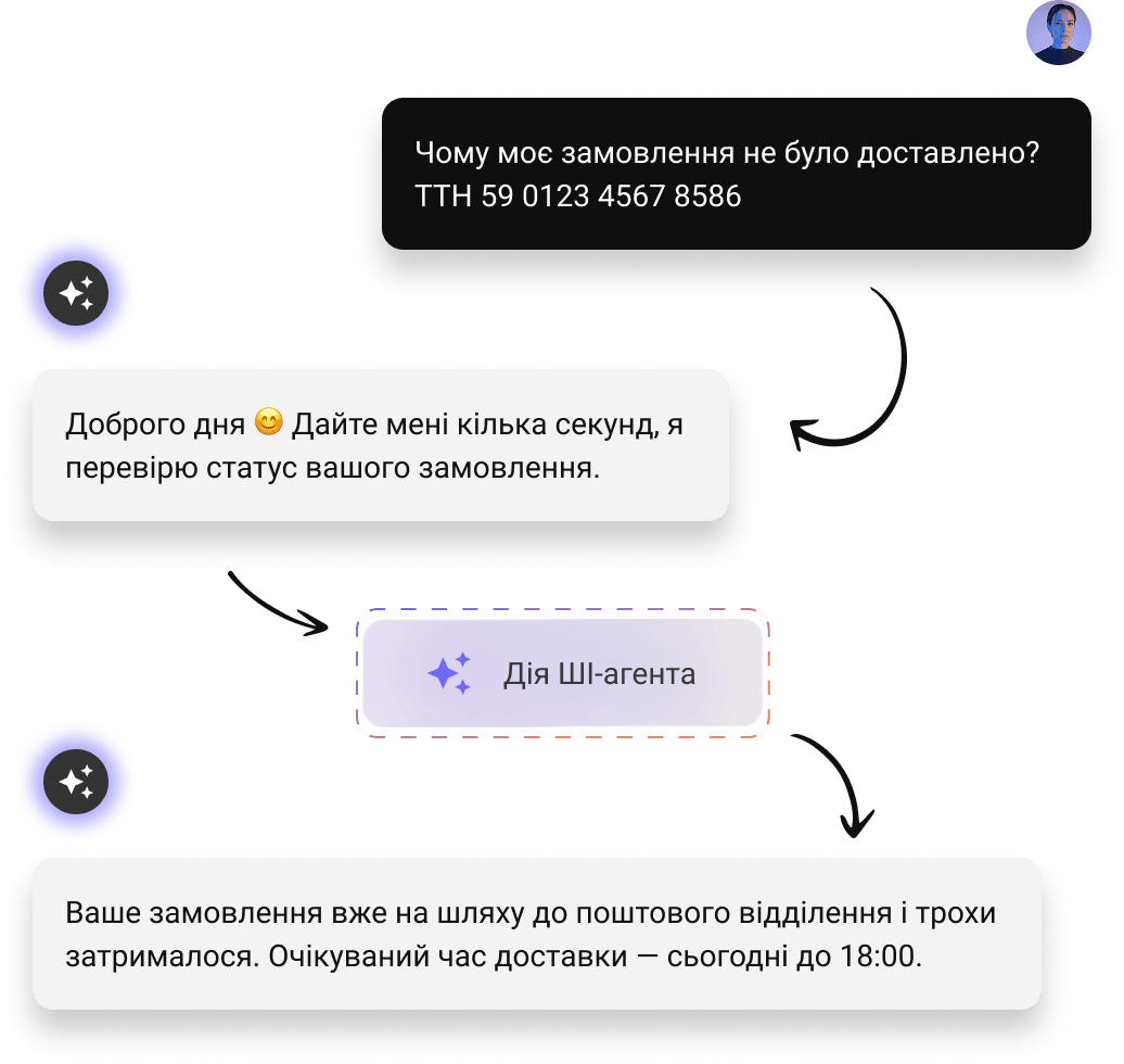 Чат-бот Intelswift працює на базі ШІ-агентів. Це означає, що всередині діалогового вікна — не просто лінійний бот, а ШІ-агент, який відповідає майже як людина, веде діалог, приймає рішення. А ще — може виконати дії, наприклад: піти на ваш ресурс та дізнатися про наявність товару, забронювати столик (coming soon), або передати запит на людину.