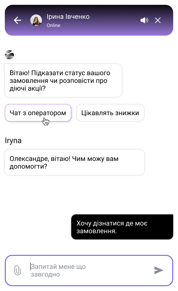 За замовченням вашим клієнтам першим завжди відповідає ШІ. Але це легко змінити в налаштуваннях. Також, клієнт завжди може сам обрати чат з оператором — і тоді ШІ переключить на людину. Ваші оператори бачать всі розмови та отримують сповіщення про нові повідомлення. Оператор бачить контекст розмови, що робить чат продуктивним з першої секунди.